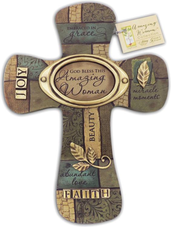 Resin wall cross features a “collage-style” design. Ready to hang. Protective white box