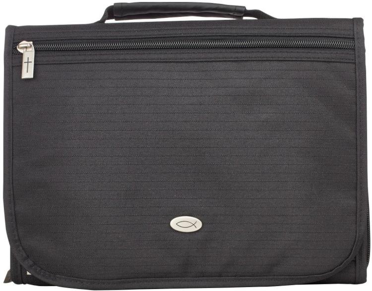 The Black Polyester Tri-fold Organizer Bible Cover with Engraved Ichthus Badge is expertly crafted for those who are deeply committed to their studies and wish for a centralized hub for all their essential study accessories.