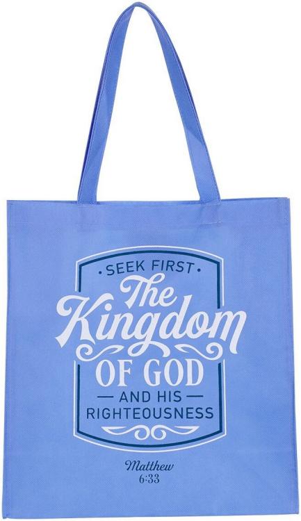 Never leave a notebook or pen behind when you use The Kingdom of God Blue Shopping Tote Bag to carry your Bible study paraphernalia. The Kingdom of God Blue Shopping Tote Bag makes a great gift bag for your trusted Bible-study leader or pastor.