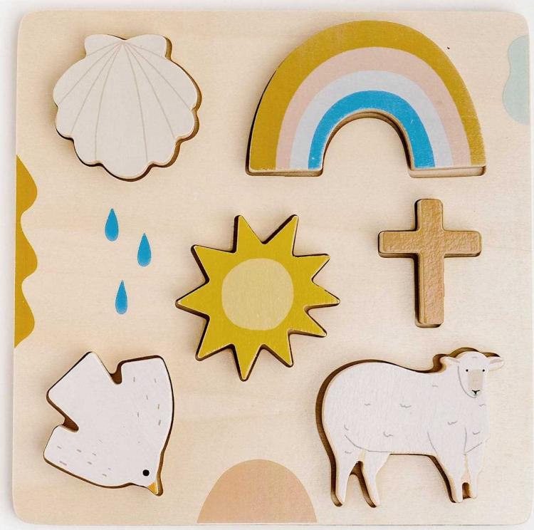 Trinity includes a sea shell, a rainbow, the sun, a cross, a dove, and a lamb.