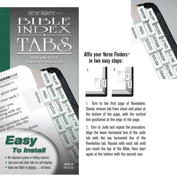Features: Easy to install – no alignment guides or folding required. Just press and stick. Tabs are self-aligning. Index your Bible in minutes…not hours. Attractive and durable for years of trouble-free use. Horizontal style – reads left to right. Compact 3/8″ design indexes a standard Bible in only 2 rows, making books easier to find.