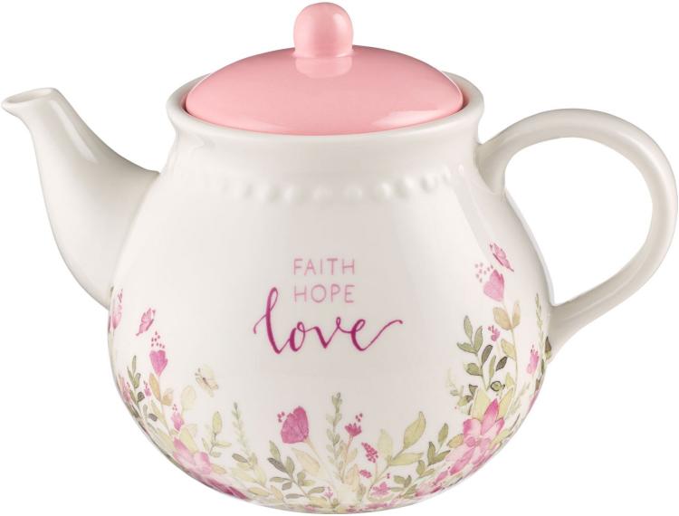 The Faith~ Hope~ and Love Petite Floral Teapot is beautifully trimmed with intricate floral patterns. It also features an inspiring sentiment that is a graceful reminder of the values that shape our interactions with ourselves~ God~ and those around us.